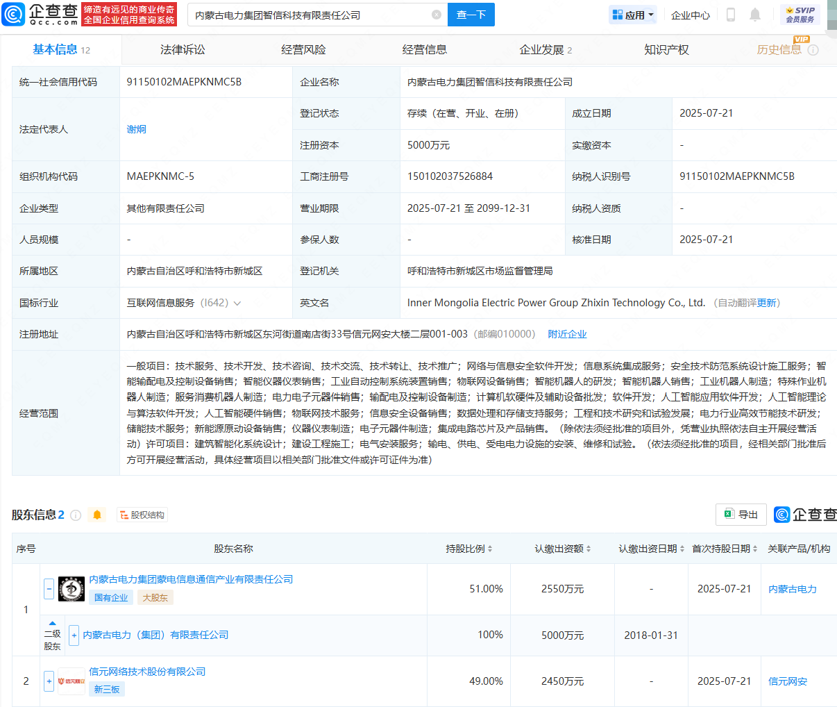 近日,内蒙古电力集团智信科技有限责任公司成立,法定代表人为谢炯,注册资本为5000万元,经营范围包含:信息系统集成服务;智能输配电及控制设备销售;智能机器人的研发;智能机器人销售;工业机器人制造等。企查查股权穿透显示,该公司由内蒙古电力(集团)有限责任公司全资子公司内蒙古电力集团蒙电信息通信产业有限责任公司、信元网络技术股份有限公司共同持股。